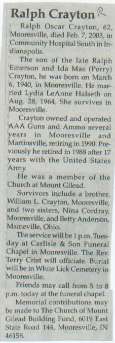 | Survived By | Widow; brother, William Crayton; 2 sisters, Nina Cordray and Betty Anderson. |