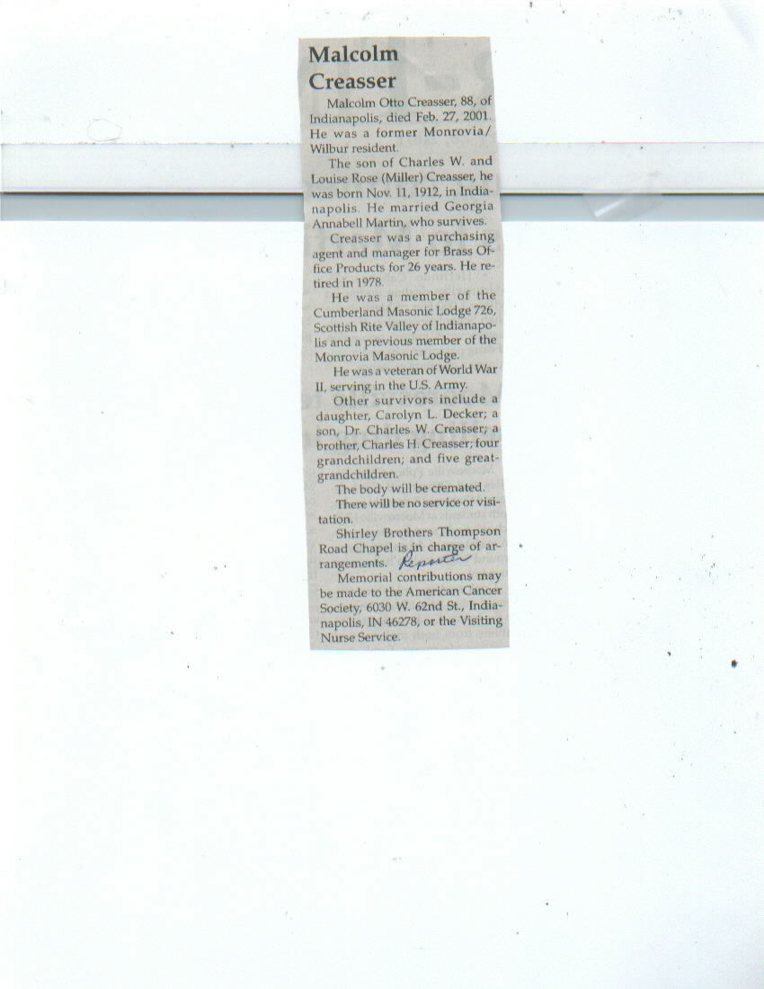 | Other | Preceded in death by parents, Charles W. and Louise Rose (Miller) Creasser. |