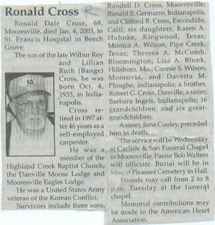 | Survived By | Three sons, Randell D. Cross, Ronald E. Gennarro, and Clifford R. Cross; 6 daughters, Karen A. Huhnke, Monica A. Wilson, Theresa A. McComb, Lisa A. Blunk, Connie S. Wilson, and Davetta M. Ploughe; brother, Robert G. Cross; sister, Barbara Ingels; 16 grandchildren; 6 great-grandchildren. |