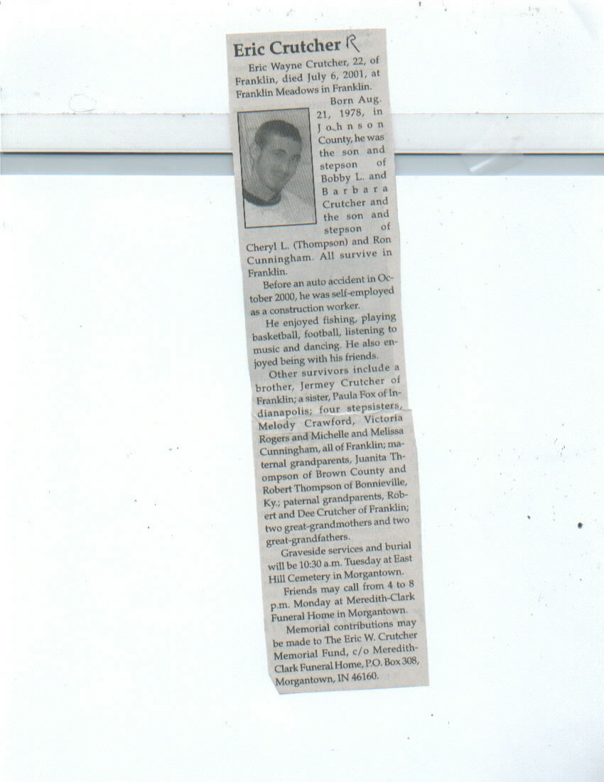 Survived By Father and stepmother, Bobby L. and Barbara Crutcher; mother and stepfather, Cheryl L. (Thompson) and Ron Cunningham; brother, Jeremey Crutcher; sister, Paula Fox; stepsisters; grandparents; great-grandparents.