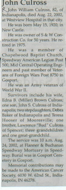 | Survived By | Widow; son, John S. Culross; 2 stepdaughters, Debra Baker and Teresa Hooser; brother, Lawrence "Bud" Culross; 3 grandchildren; one great-grandchild. |