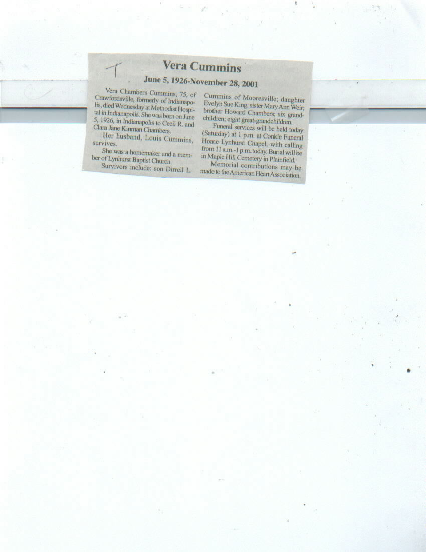 | Survived By | Spouse; son, Dirrell L. Cummins; daughter, Evelyn Sue King; sister, Mary Ann Weir; brother, Howard Chambers; 6 grandchildren; 8 great-grandchildren. |