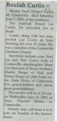 | Survived By | Sons, Fred Lee and Tom Curtis; stepdaughter, Mary Lee Harcourt; brothers, Marlin Shupe and Kenny Shupe; sister, Neti Hicks; 5 grandchildren; 7 great-grandchildren. |