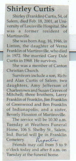 | Survived By | Spouse; son, Richard Alan Curtis; daughters, Amy Jefferson and Susan Graves; brothers, Larry, Jim, and Ben Franklin; sister, Beverly Houston. |