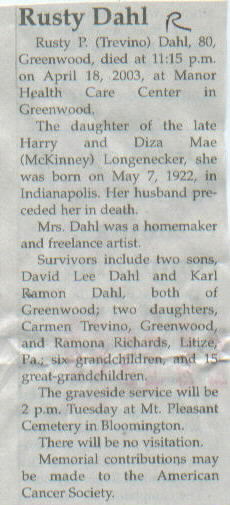 | Survived By | Two sons, David Lee and Karl Ramon Dahl; 2 daughters, Carmen Trevino and Ramona Richards; 6 grandchildren; 15 great-grandchildren. |
