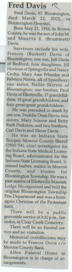 | Survived By | Widow; son, Jeff Davis; 4 daughters, Jill Hovious, Nancy Crohn, Mary Ann Whistler, and Rebecca Norris; sister, Nellie Skirvin; brother, Paul Davis; 17 grandchildren; 18 great-grandchildren; 4 great-great grandchildren. |