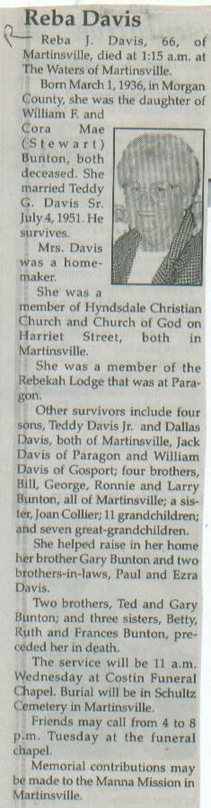 Survived By Spouse; 4 sons, Teddy Davis, Jr., Dallas, Jack, and William Davis; 4 brothers, Bill, George, Ronnie, and Larry Bunton; sister, Joan Collier; 11 grandchildren; 7 great-grandchildren.