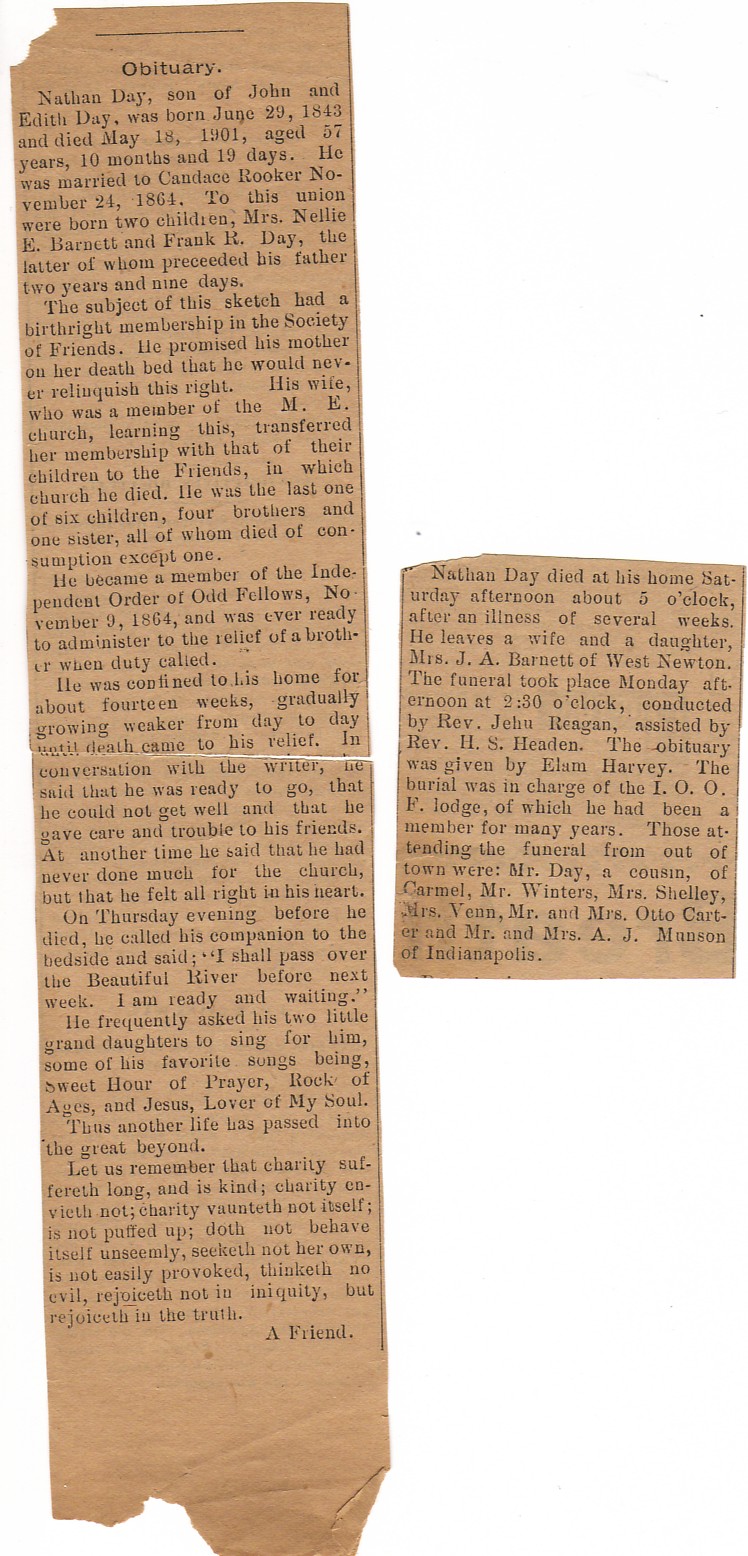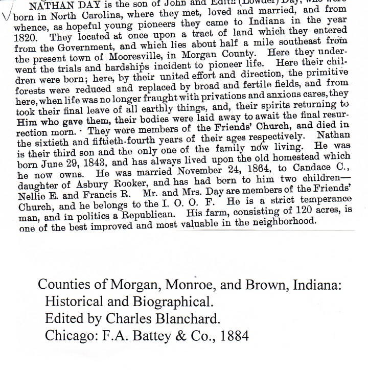 | Other | Age 57 years, 10 months, 19 days. Son of John and Edith Lowder Day; he was the last one of six children, with four brothers and one sister, all of whom died of consumption except one. He married Candace Rooker on November 24, 1864. They had two children: Mrs. Nellie E. Barnett, and Frank Rooker Day, the latter of whom preceded his father in death by two years and nine days. Member of the Society of Friends. Joined I.O.O.F. on November 9, 1864. Had been confined to his home for about fourteen weeks. Buried in the family plot at Mooresville cemetery. |