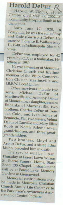 | Survived By | Widow; 2 sons, Michael and Anthony DeFur; daughter, Sandra Eubanks; 2 brothers, Charles and Ivan DeFur; 2 sisters, Velma DeFur and Mary Ellen Robb; 7 grandchildren; 3 great-grandchildren. |