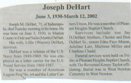 | Survived By | Widow; son, Jay D. DeHart; brothers, Chester and Don DeHart, Sr.; sisters, Edna Faye Moran, Adeline Lair, Marlene Miller, and Charlene Chadd. |