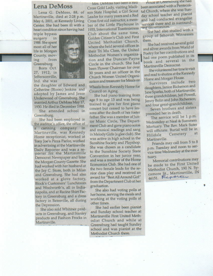| Other | Preceded in death by parents, Edward and Catherine (Bloom) Jenkins; adoptive parents, James and Jesse Underwood; spouse; 7 brothers and sisters. |