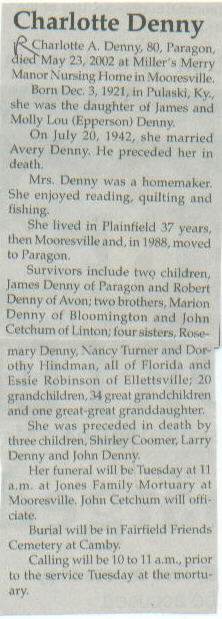 | Survived By | Two children, James and Robert Denny; 2 brothers, Marion Denny and John Cetchum; 4 sisters, Rosemary Denny, Nancy Turner, Dorothy Hindman, and Essie Robinson; 20 grandchildren; 34 great-grandchildren; great-great-granddaughter. |