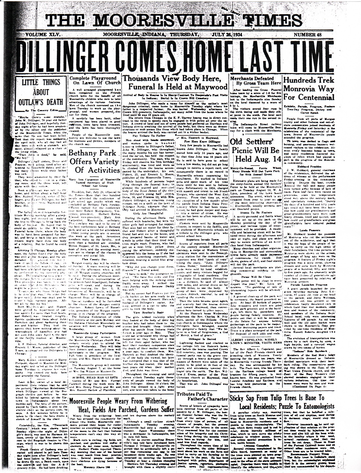 | Other | Notorious bank robber who received much media attention for a short career of robberies and escapes from September 1933 to July 1934. Was shot by police and federal agents in Chicago. There was a public viewing of the body at Cook County Morgue, then the body was taken to McCready Funeral Home. His family brought his body home, where services were held at the home of Dillinger's sister, Audrey Hancock, in Maywood. The body was next taken to the Harvey Funeral Home in Mooresville for visitation. He was buried on Wednesday, July 25, in Crown Hill Cemetery in Indianapolis. [He was born in the Oak Hill neighborhood of Indianapolis, but spent his adolescence on a farm just outside Mooresville. His new home town was the site of his first robbery, of a local grocer.] His father was highly regarded and well respected in town. |