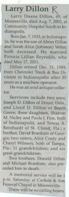 | Survived By | Two sons, Joseph and Lloyd D. Dillon; 3 daughters, Sharron M. Nicley, Paula J. Fine, and Teresa A. Reinhardt; brother, David Branham; 2 sisters, Alice Crady and Cheryl Wilmers; 11 grandchildren; 6 great-grandchildren. |