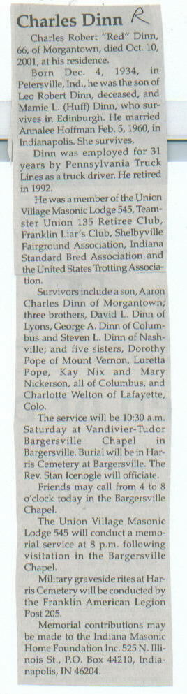 | Survived By | Spouse; mother, Mamie L. (Huff) Dinn; son, Aaron Charles Dinn; brothers, David L., George A., and Steven L. Dinn; sisters, Dorothy Pope, Luretta Pope, Kay Nix, Mary Nickerson, and Charlotte Welton. |