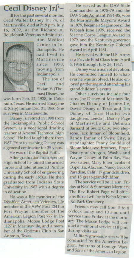 | Survived By | Widow; 4 sons, Joe, Charles, David, and Tim Disney; 2 daughters, Lenda J. Disney Page and Deborah Barnard; 2 stepsons, Jack and Randy Inman; stepdaughter, Penny Smiddie; 2 brothers, Roger and Wayne Disney; 2 sisters, Mary Ellen Jacobs and Nancy Beck; 17 grandchildren; 15 great-grandchildren. |