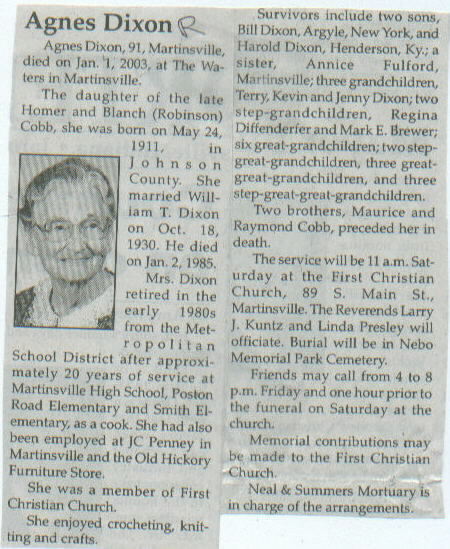 | Survived By | Two sons, Bill and Harold Dixon; sister, Annice Fulford; 3 grandchildren, Terry, Kevin, and Jenny Dixon; 2 stepgrandchildren, Regina Diffenderfer and Mark E. Brewer; 6 great-grandchildren; 2 stepgreat-grandchildren; 3 great-great-grandchildren; 3 stepgreat-great-grandchildren. |