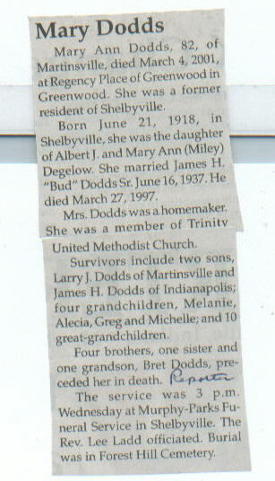 | Survived By | Sons, Larry J. and James H. Dodds; 4 grandchildren; 10 great-grandchildren. |