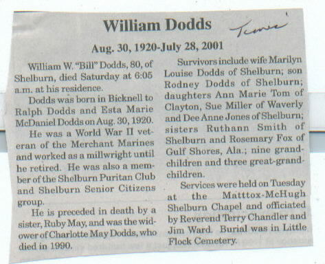 | Other | Preceded in death by spouse, Charlotte May Dodds; parents, Ralph and Esta Marie (McDaniel) Dodds; sister, Ruby May. |