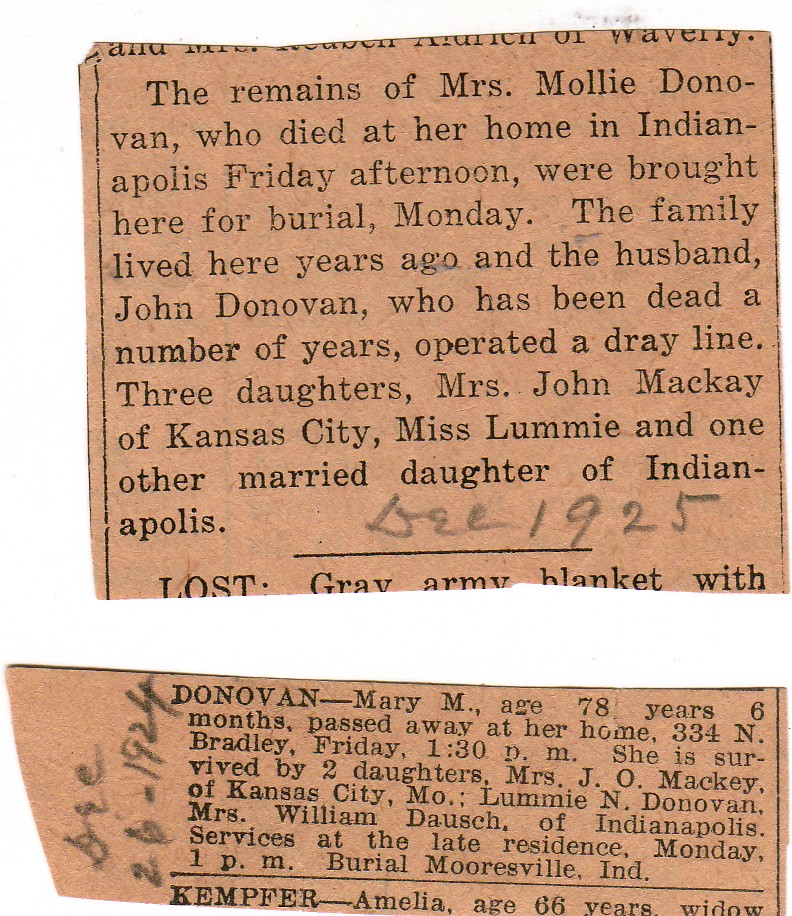 | Other | Married on Dec. 12, 1866 in Morgan Co., Ind. Buried in Donovan family plot, Mooresville Cemetery. |