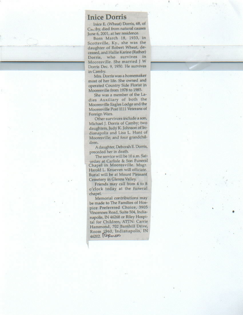 | Other | Preceded in death by father, Robert Wheat; daughter, Deborah E. Dorris. |