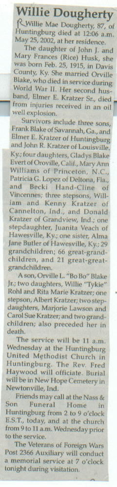 Survived By Three sons, Frank Blake, and Elmer E. and John R. Kratzer; 4 daughters, Gladys Blake Evert, Mary Ann Williams, Patricia G. Lopez, and Becki Hand-Cline; 3 stepsons, William, Kenny, and Donald Kratzer; stepdaughter, Juanita Veach; sister, Alma Jane Butler; 29 grandchildren; 66 great-grandchildren; 21 great-great-grandchildren.