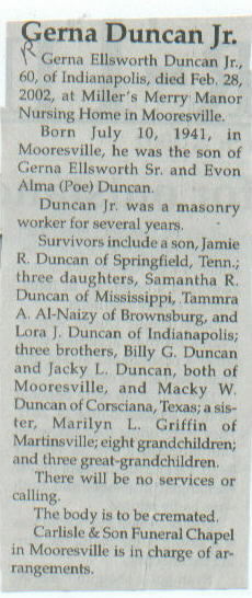 | Survived By | Son, Jamie R. Duncan; 3 daughters, Samantha R. Duncan, Tammra A. Al-Naizy, and Lora J. Duncan; 3 brothers, Billy, Jack, and Macky W. Duncan; sister, Marilyn L. Griffin; 8 grandchildren; 3 great-grandchildren. |