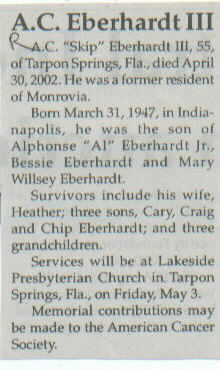 | Survived By | Widow; 3 sons, Gary, Craig, and Chip Eberhardt; 3 grandchildren. |