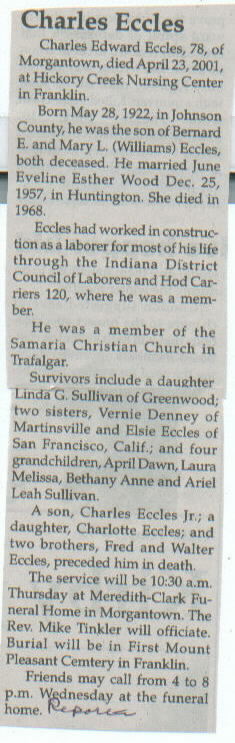 Other Preceded in death by parents, Bernard E. and Mary L. (Williams) Eccles; spouse; son, Charles Eccles, Jr.; daughter, Charlotte Eccles; brothers, Fred and Walter Eccles.