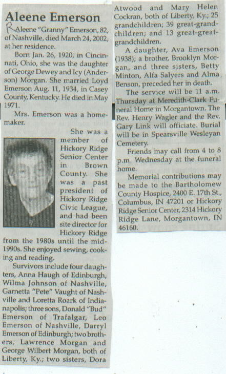 | Survived By | Four daughters, Anna Haugh, Wilma Johnson, Garnetta "Pete" Vaught, and Loretta Roark; 3 sons, Donald "Bud" Emerson, Leon Emerson, and Darryl Emerson; 2 brothers, Lawrence Morgan and George Wilbert Morgan; 2 sisters, Dora Atwood and Mary Helen Cockran; 25 grandchildren; 39 great-grandchildren; 13 great-great-grandchildren. |