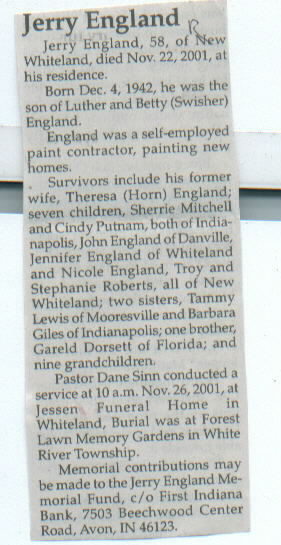 | Survived By | Former wife, Theresa (Horn) England; children, Sherrie Mitchell, Cindy Putnam, John England, Jennifer England, Nicole England, and Troy and Stephanie Roberts; sisters, Tammy Lewis and Barbara Giles; brother, Gareld Dorsett; 9 grandchildren. |