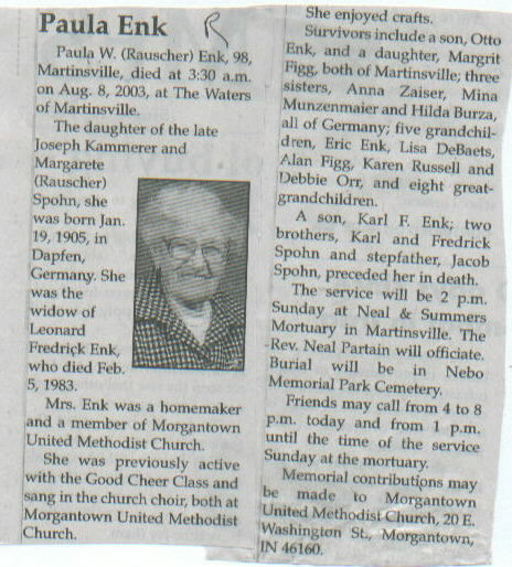 | Other | Preceded in death by a son, Karl F. Enk; two brothers, Karl and Fredrick Spohn; and stepfather, Jacob Spohn. |