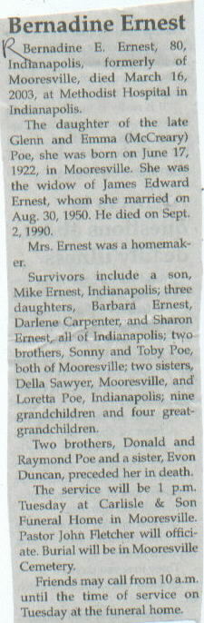 | Survived By | Son, Mike Ernest; 3 daughters, Barbara Ernest, Darlene Carpenter, and Sharon Ernest; 2 brothers, Sonny and Toby Poe; 2 sisters, Della Sawyer and Loretta Poe; 9 grandchildren; 4 great-grandchildren. |
