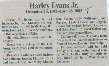 | Survived By | Widow; 5 children, Joseph, Murphy, Chris, and Jamie Evans, and Vicky Mount; 4 sisters, Judy Williams, Janet Ramsey, Linda Lawson, and Virginia Evans; 4 brothers, Robert, Don, Steve, and Scott Evans; 15 grandchildren; 4 step-great-grandchildren. |