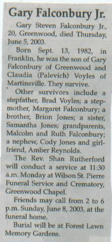 Survived By Parents, Gary Falconbury of Greenwood and Claudia (Palevich) Voyles of Martinsville; stepfather, Brad Voyles; stepmother, Margaret Falconbury; brother, Brion Jones; sister, Samantha Jones; grandparents, Malcolm and Ruth Falconbury; nephew, Cody Jones; girlfriend, Amber Reynolds.