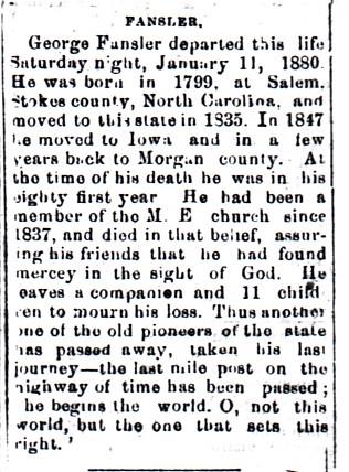 | Other | Age 80. Born in 1799 in Salem, Stokes County, North Carolina. Moved to Indiana in 1835. In 1847, moved to Iowa, and in a few years, back to Morgan County, Indiana. Member of M.E. Church since 1837. [From the Diary of Elam Harvey for Jan. 18, 1880: "Bro. Hays preached the funeral of George Fanslow at 1/2 past two. He died last night after having been sick for several weeks. He died principally from old age, being 81 years old."] |