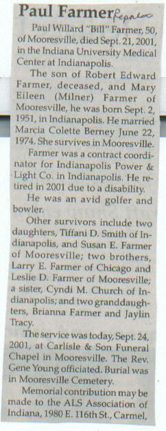 | Survived By | Spouse; mother, Mary Eileen (Milner) Farmer; daughters, Tiffani D. Smith and Susan E. Farmer; brothers, Larry E. and Leslie D. Farmer; sister, Cyndi M. Church; 2 granddaughters. |