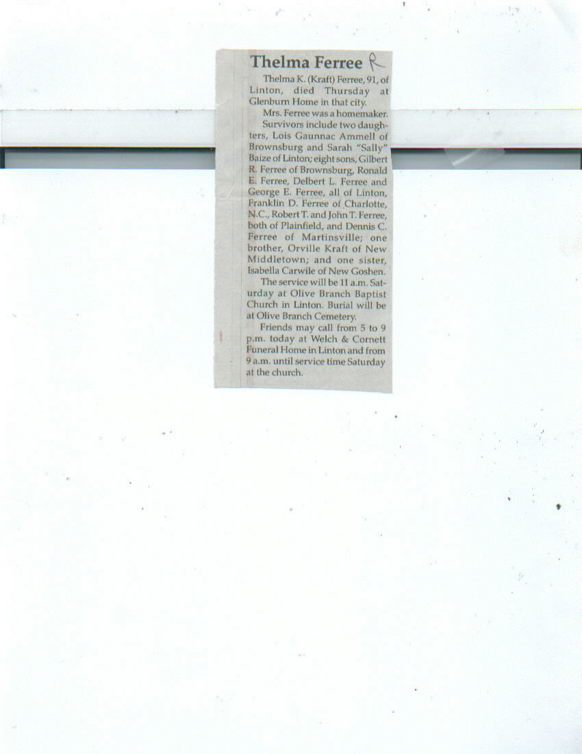Survived By Daughters, Lois Gaunac Ammell and Sarah Baize; sons, Gilbert R., Ronald E., Delbert L., George E., Franklin D., Robert T., John T., and Dennis C. Ferree; brother, Orville Kraft; sister, Isabella Carwile.