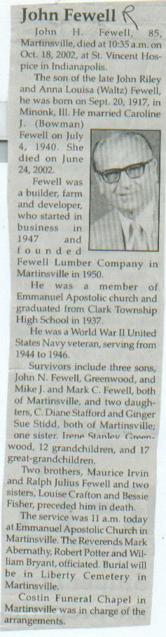 | Survived By | Three sons, John N., Mike J., and Mark C. Fewell; 2 daughters, C. Diane Stafford and Ginger Sue Stidd; sister, Irene Stanley; 12 grandchildren; 17 great-grandchildren. |