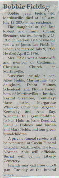 | Survived By | Son, Allen Fields; 2 daughters, Debra Holmes Schoolcraft and Phyllis Bailey; brother, Kermit Sizemore; 3 sisters, Margarette Whitaker, Sue Sargeant, and Ann Ray; 5 grandchildren, Joshua Holmes, Jesse Kendred, Danielle Holmes, and Jordan and Mark Fields; 4 great-grandchildren. |