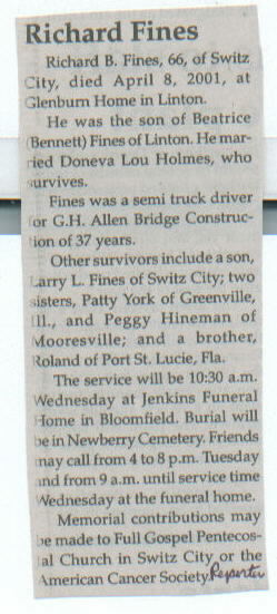 | Survived By | Son, Larry L. Fines; sisters, Patty York and Peggy Hineman; brother, Roland Fines; spouse. |