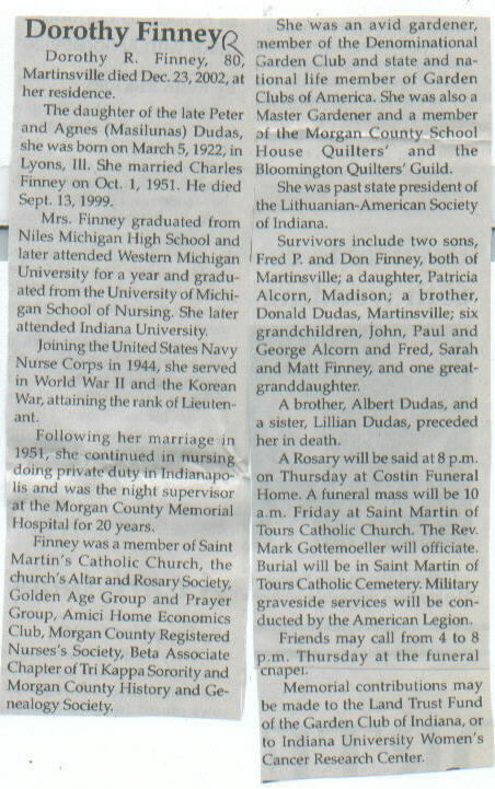 Survived By Two sons, Fred P. and Don Finney; daughter, Patricia Alcorn; brother, Donald Dudas; 6 grandchildren; great-granddaughter.