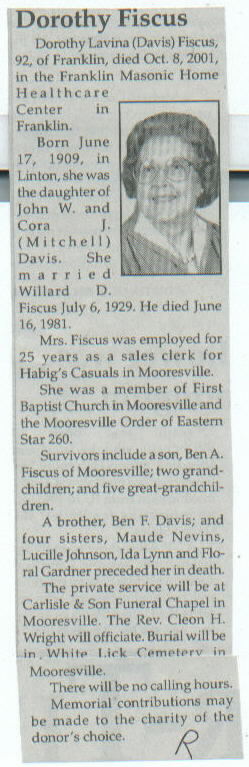 Other Age 92. Preceded in death by spouse; parents, John W. and Cora J. (Mitchell) Davis; brother, Ben F. Davis; sisters, Maude Nevins, Lucille Johnson, Ida Lynn, and Floral Gardner.