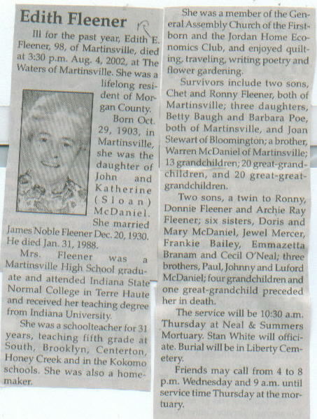 | Survived By | Two sons, Chet and Ronny Fleener; 3 daughters, Betty Baugh, Barbara Poe, and Joan Stewart; brother, Warren McDaniel; 13 grandchildren; 20 great-grandchildren; 20 great-great-grandchildren. |