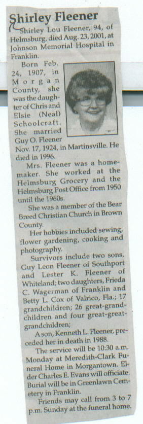 | Survived By | Sons, Guy Leon and Lester K. Fleener; daughters, Frieda C. Wagerman and Betty L. Cox; 17 grandchildren; 26 great-grandchildren; 4 great-great-grandchildren. |