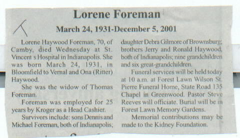| Survived By | Sons, Dennis and Michael Foreman; daughter, Debra Gilmore; brothers, Jerry and Ronald Haywood; 9 grandchildren; 6 great-grandchildren. |