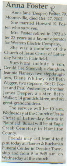| Survived By | Spouse; son, Gerald Lee Streeval; daughter, Jeannie Flanery; 2 stepdaughters, Diane Whitney and Beth Wiggen; 2 stepsons, Eric D. Foster and Paul Weitemier; brother, James Desper; sister, Betty Walker; 14 grandchildren; 6 great-grandchildren. |
