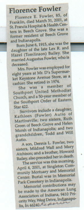 Other Preceded in death by spouse; parents, Lex R. and Hazel (Tomlinson) Bailey; son, Dennis L. Fowler; sisters, Mildred Wall and Mary Atchison; brother, Howard Bailey.