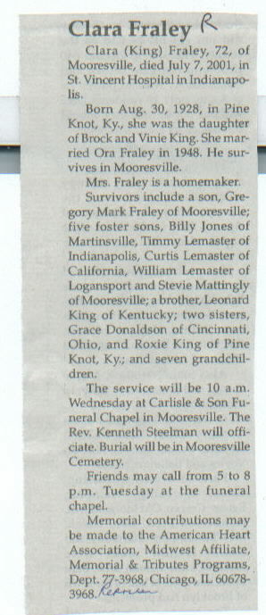 | Survived By | Spouse; son, Gregory Mark Fraley; brother, Leonard King; sisters, Grace Donaldson and Roxie King; 7 grandchildren; 5 foster sons. |