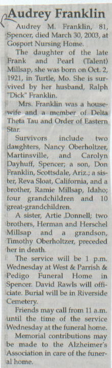 | Survived By | Spouse; 2 daughters, Nancy Oberholtzer and Carolyn Dayuff; son, Don Franklin; sister, Reva Sloat; brother, Ramie Millsap; 4 grandchildren; 10 great-grandchildren. |
